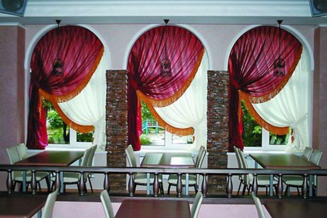 - Restaurant, salle de banquet, hôtel. Étant donné que les pièces sont grandes et nécessitent une source de lumière supplémentaire, la meilleure option serait d'utiliser des rideaux avant le virage en arc. L'arche peut être décorée avec des draperies supplémentaires.