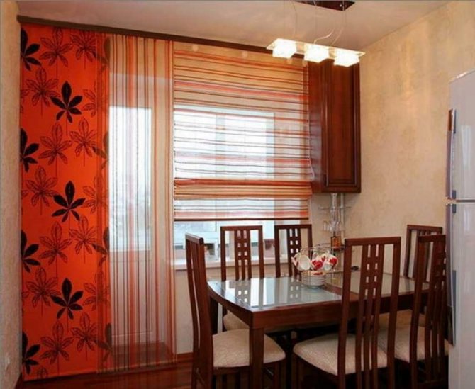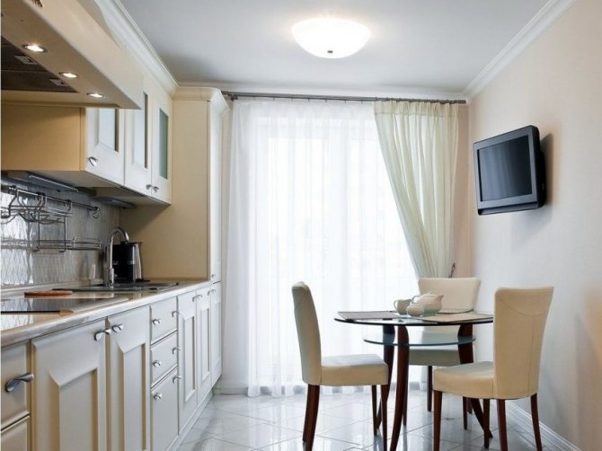 L'espace de cuisine classique est carré ou rectangulaire. Il en découle que la porte du balcon est souvent située en face de l'entrée de la cuisine. Cette disposition est considérée comme acceptable et vous permettra de choisir des rideaux pour l'ouverture. À l'avenir, ils n'interféreront pas avec la libre circulation de la cuisine.