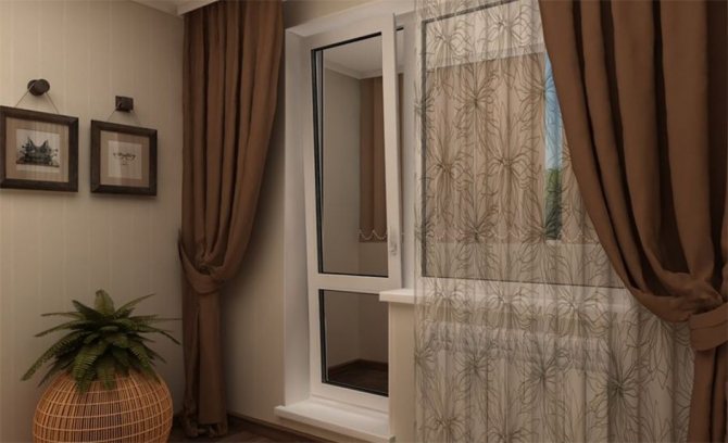 Il n'y a que deux châssis qui s'ouvrent sur les fenêtres du balcon, cependant, la décoration avec des rideaux est effectuée sur tout le périmètre du vitrage, ce qui, à son tour, pose des exigences pour les dimensions du décor de la fenêtre - des rideaux compacts pour le balcon sont appropriés ici, et de longs rideaux pleine grandeur qui voleront la part du lion de l'espace libre ne peuvent même pas être envisagés.