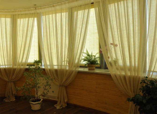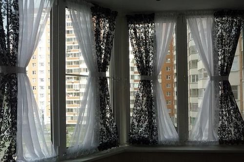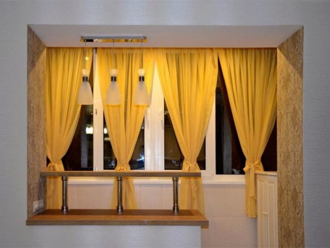 Un rideau classique peut également être cousu à partir d'un matériau plus dense. Dans le même temps, s'il est nécessaire que la lumière du soleil pénètre dans le balcon, vous devez choisir un matériau pour le rideau en tissus transparents légers.