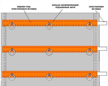 Aux endroits marqués pour la fixation des rails, il est nécessaire de coudre des anneaux. Vous devrez probablement les coudre à la main, puis enfiler un cordon le long de ces anneaux. En tirant ou en desserrant le cordon, le rideau se soulève.