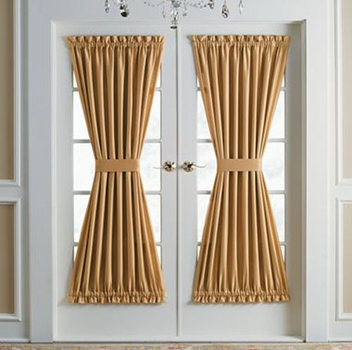 Dans le même temps, les techniques standard de décoration des fenêtres impliquent l'utilisation de rideaux pour la fenêtre elle-même et de panneaux pour couvrir tout le mur. Si la présence d'un voile est indispensable, les designers proposent de le diviser en deux parties, en le soulevant en soute et en drapant celle devant la porte.Cette approche de conception permet dans une certaine mesure de fournir un accès libre au fonctionnement de la porte, sans nuire à l'esthétique du rideau.