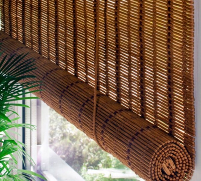 Privilégiez les produits fabriqués à partir de matériaux naturels - bambou, bois ou papier ondulé. À la maison, les stores en papier à faire soi-même peuvent être assemblés à partir d'un morceau de papier peint dense; Les stores romains sont des panneaux de tissu rectangulaire vertical dont la position est ajustée à l'aide de cordes cousues dans le textile. Ce sont des rideaux laconiques, mais élégants pour le balcon. On distingue les panneaux romains droits et en cascade - sur les produits droits, les plis horizontaux n'apparaissent que dans une position semi-fermée, tandis que dans la version en cascade, ils sont présents même avec des rideaux ouverts, ce qui est obtenu en drapant le tissu pendant la couture.