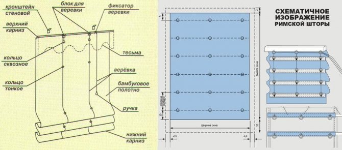 Un rideau de style romain est un tissu naturel ou synthétique attaché à une tringle à rideau.À partir du bord inférieur, le tissu est renforcé avec une barre de contrepoids, de sorte qu'une fois déplié, le tissu s'accroche à plat sur la loggia. À chaque section de la toile, il y a des bandes qui sont creuses à l'intérieur, dans lesquelles des bandes de bois, de métal ou de plastique sont cousues. Pour le même ruban, des anneaux sont attachés à travers lesquels le cordon sera étiré. Vous pouvez faire des rideaux pour une loggia de style romain sans utiliser de bandes métalliques, puis les vagues tomberont dans des plis plus doux.