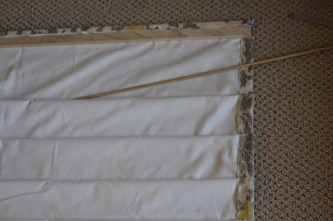 Nous utilisons des sections supplémentaires du tissu comme allocation pour attacher les barres; Coupez le tissu à la taille; Nous appliquons deux toiles avec le côté intérieur extérieur l'une à l'autre, cousons les côtés sur 3 bords, en laissant la coupe inférieure intacte; Tournez le connecté toiles et coudre la coupe inférieure. Nous repassons le tissu; posons la pièce face vers le bas et marquons sur la coupe supérieure et inférieure du tissu la distance des poches pour les lattes, enveloppant le bloc de bois attaché au textile; Rentrez le tissu et cousez-le le long de la couture marquée. Dans les poches résultantes, nous installons les bandes; Maintenant, nous installons les vis dans la bande supérieure, avec lesquelles le rideau à roulettes sera attaché à la ceinture.