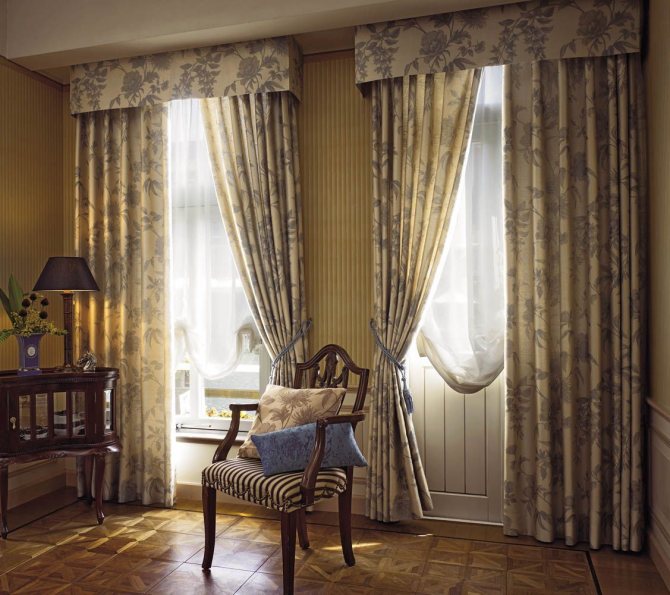 Une autre option peut être la conception dite du miroir, lorsque les ouvertures des fenêtres sont décorées avec les mêmes rideaux imprimés. En plus, un lambrequin peut être utilisé, reliant les deux corniches, formant un auvent confortable.