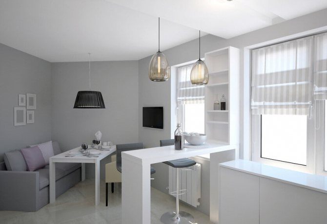 Cuisine-salon pour deux fenêtres dans le style du minimalisme: rideaux de coupe classique, rideaux - type japonais