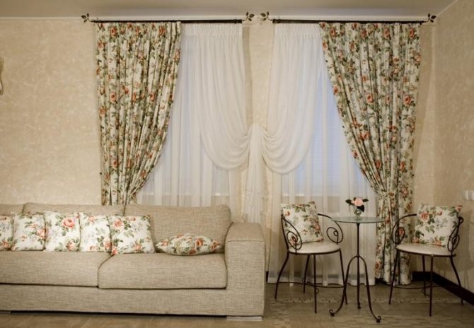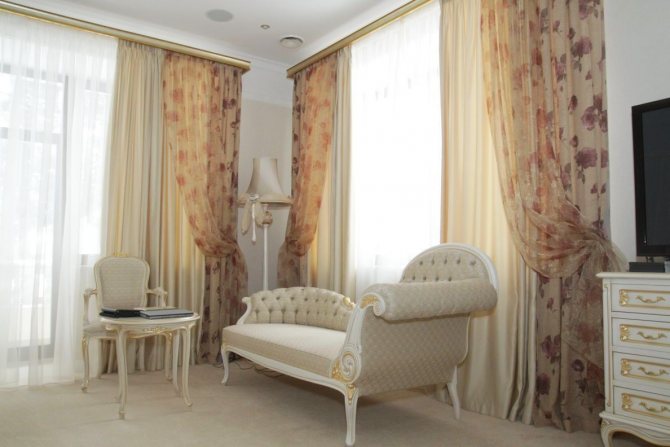 Une combinaison classique dans le style Art Nouveau - les rideaux pour 2 fenêtres sont décorés de tulle large et de deux toiles qui drapent symétriquement des deux côtés