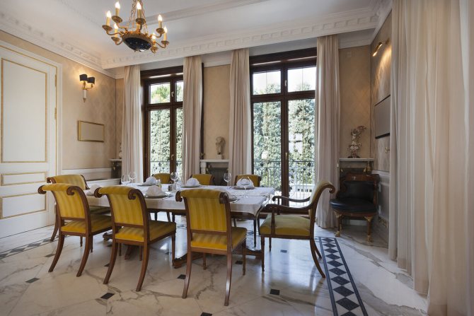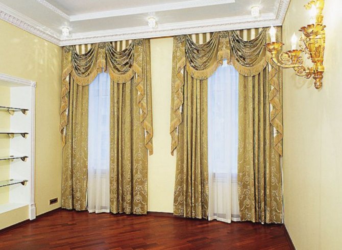 Les rideaux pour ouvertures étroites et longues conviennent mieux dans un style classique. Ils mettront l'accent sur la sophistication et la sophistication. La présence d'un lambrequin élargira visuellement le design. Et en combinant les deux en une seule composition, à l'aide de rideaux dans le mur, vous obtenez l'effet d'une grande fenêtre.