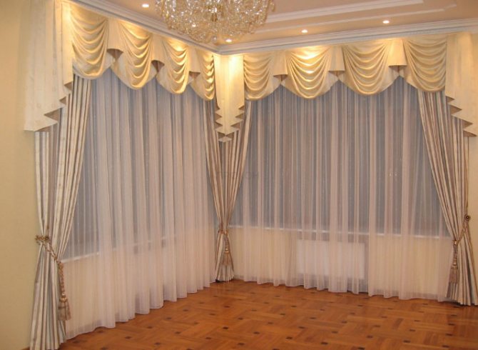 Une composition intéressante pour décorer les fenêtres de la salle à manger-salon en tulle translucide et des rideaux avec un lambrequin en satin soyeux délicat