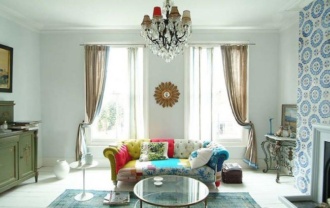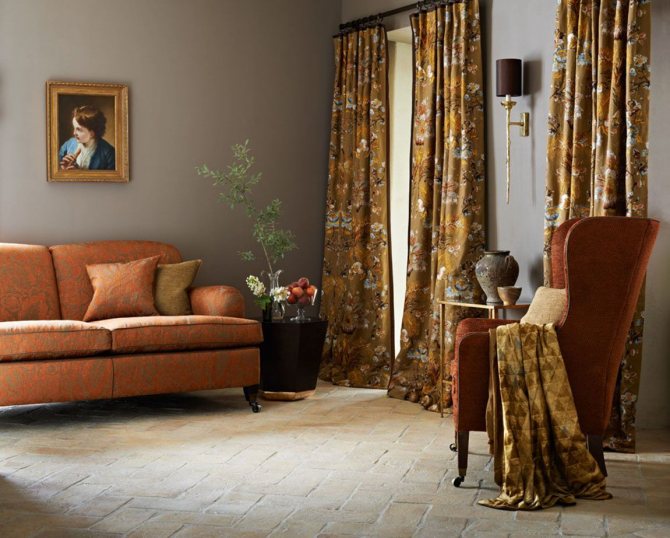 S'il est impossible d'obtenir un style uniforme dans une pièce, les concepteurs modernes recommandent de se concentrer sur les paramètres du plus grand élément de décoration: tapis, canapé, armoire - et de choisir le matériau des rideaux, en se concentrant sur sa couleur et ses performances.