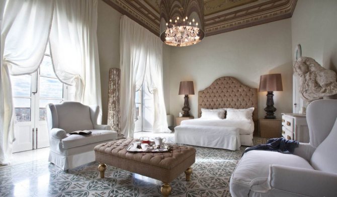 - Hôtels. Dans les hôtels, la sécurité et le confort sont importants, donc les tissus ne doivent pas provoquer d'allergies, il est bon d'utiliser des tissus synthétiques (polyester). Les rideaux baroques et modernes seront magnifiques ici.