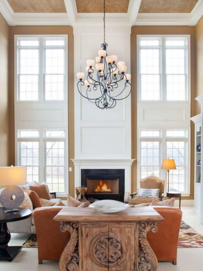 La disposition des fenêtres sur les murs adjacents vous permet d'allouer de l'espace entre les ouvertures pour un canapé, une cheminée, une commode d'origine