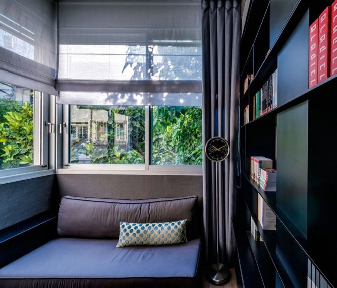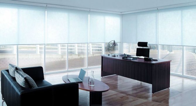 - Des bureaux. Les tissus stricts sont choisis ici. Le rideau met en valeur le style professionnel, protège de la lumière. Vous pouvez également envisager des options: volets roulants jour-nuit, à entraînement électrique, plissés.