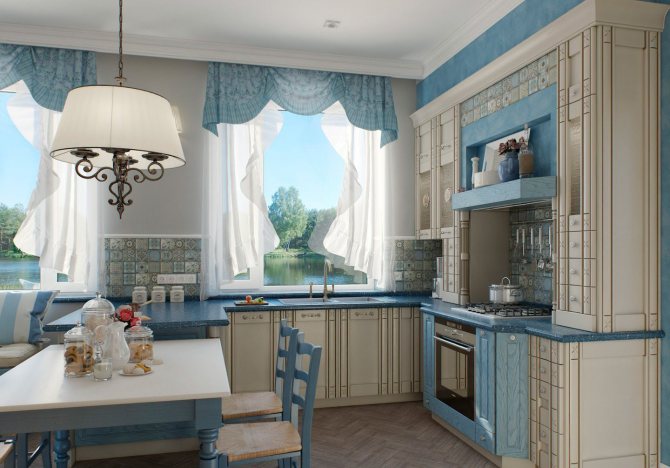 Une cuisine avec deux fenêtres est généralement grande, avec un niveau d'éclairage élevé, vous ne devez donc pas suspendre les fenêtres avec de lourds rideaux.