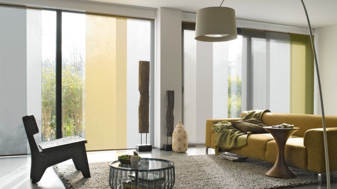 Les stores romains d'une seule couleur seront une excellente solution de conception pour une maison de campagne. - Les panneaux japonais qui se déplacent horizontalement le long de l'ouverture de la fenêtre sont parfaits pour le zonage;