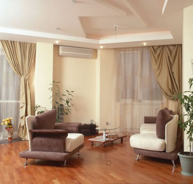 - Utilisation de rideaux parallèles de différentes longueurs. L'option est la plus pratique pour les fenêtres combinées avec une porte donnant sur le balcon.