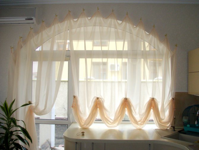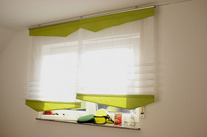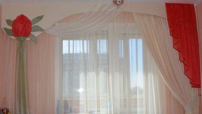 - Au lieu de deux rideaux parallèles, en utilisant une toile large, en le fixant avec une pince sur un côté. Vous pouvez y ramasser un lambrequin asymétrique.