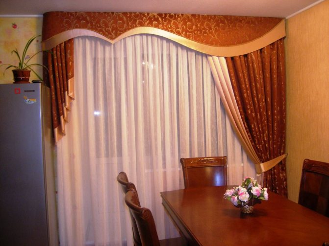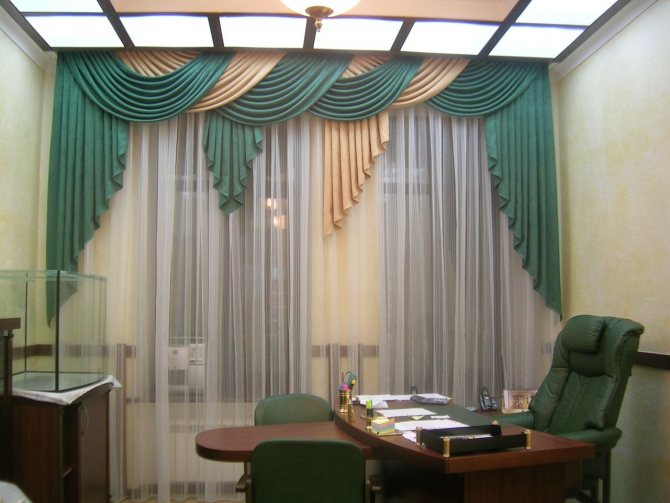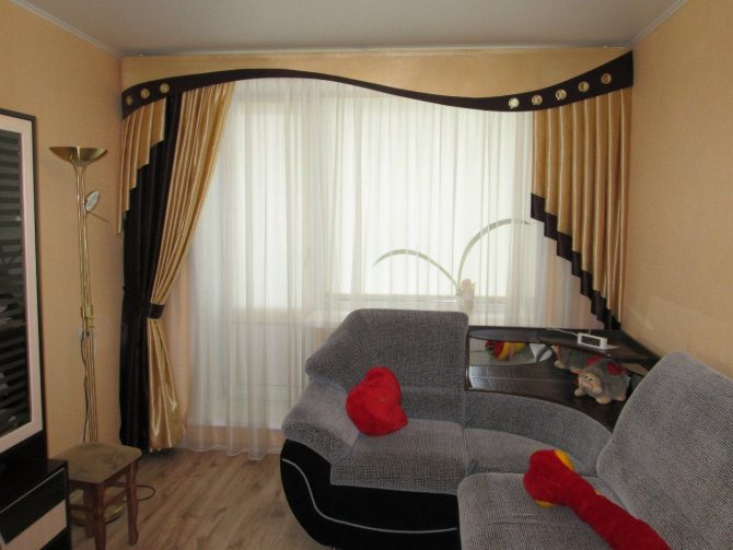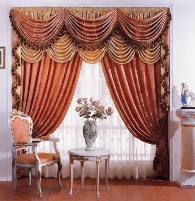 - Composition multicouche: rideaux, lambrequin, tissu pour rideaux. Se compose de plusieurs parties de formes et de longueurs différentes.