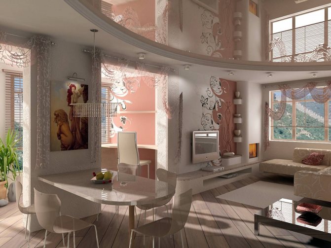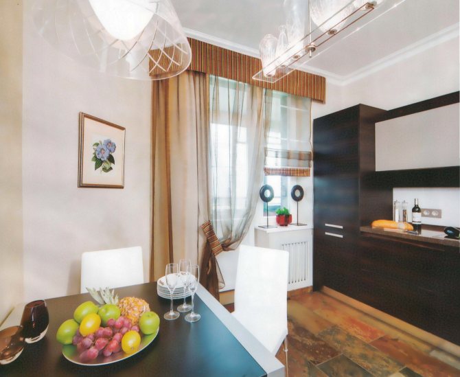 , qui passe en douceur dans le salon, vous devez regarder les rideaux sur le sol, tout comme ceux qui pendent dans le salon. Étant donné que les pièces sont connectées, elles devraient avoir le même style.