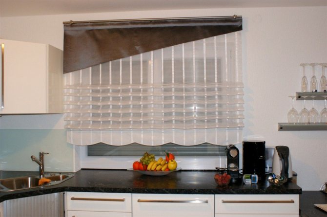 Le matériau perforé léger est une excellente option pour une petite cuisine. De tels textiles élargiront visuellement l'espace sans bloquer le chemin de la lumière naturelle à travers la fenêtre.