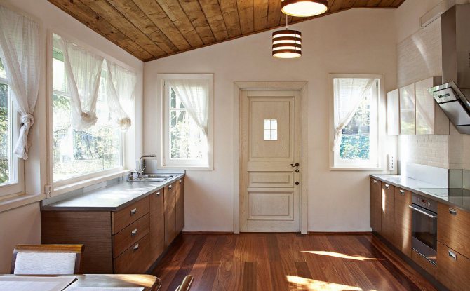 - Un rideau coupé en diagonale pour ne couvrir qu'une partie de la fenêtre. D'un côté, le rideau s'étend au sol ou au rebord de la fenêtre. Cette option est la mieux adaptée aux cuisines.