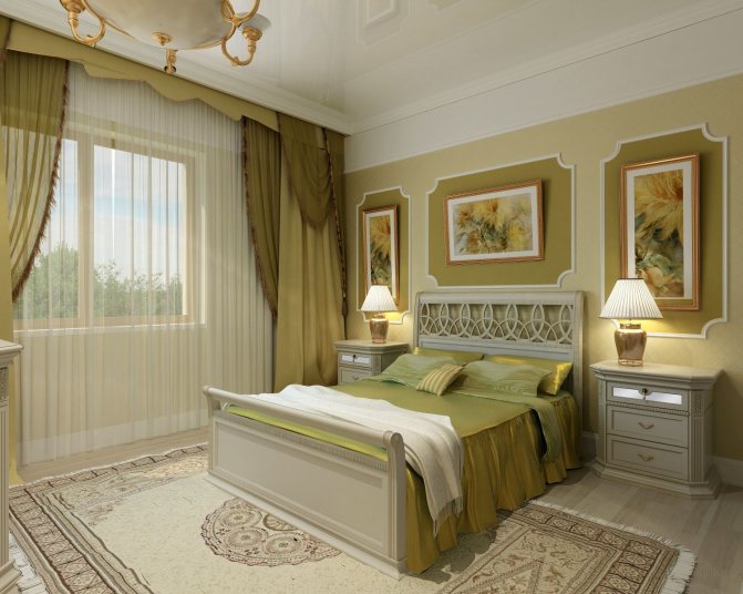 La teinte herbeuse sourde des rideaux et des oreillers décoratifs est la même, mais les façades du casque diffèrent par le ton. Mais grâce à une échelle, cette différence ne perturbe pas l'équilibre des couleurs dans la pièce.