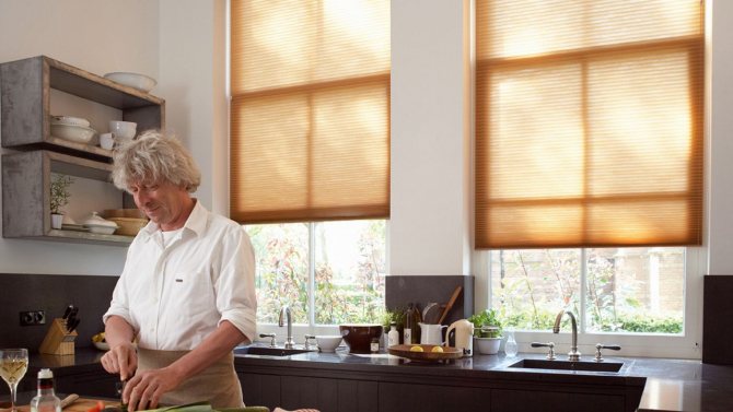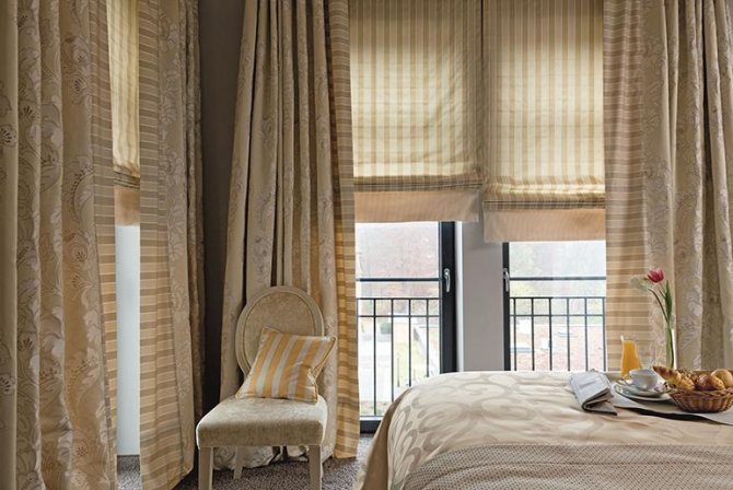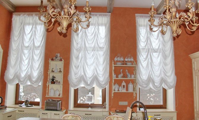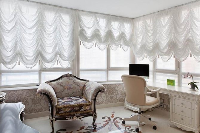 - Dans les magasins de meubles, objets anciens - rideaux autrichiens faciles à utiliser, modèles à rouleaux combinés avec des rideaux transparents légers.