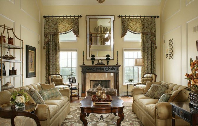 Les rideaux italiens en soie, satin, tapisserie serviront de design universel pour un salon festif confortable. Décorer de grandes fenêtres avec des rideaux autrichiens ou français ajoutera un charme particulier.