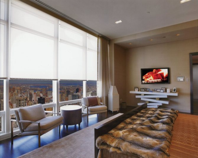 Les fenêtres panoramiques sont très importantes, en particulier parce qu'elles élargissent visuellement la pièce. Il est également judicieux de faire une fenêtre panoramique où une vue pittoresque s'ouvre derrière elle, alors que le paysage qui s'ouvre n'a pas d'importance: une ville ou une nature. Les deux peuvent être agréables à regarder, surtout si vous choisissez les bons rideaux pour les fenêtres panoramiques.