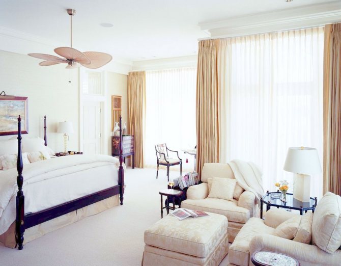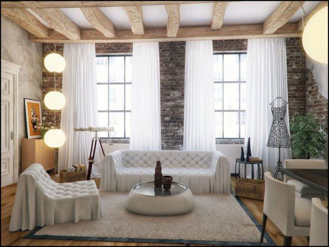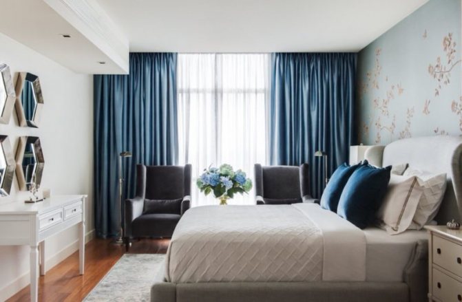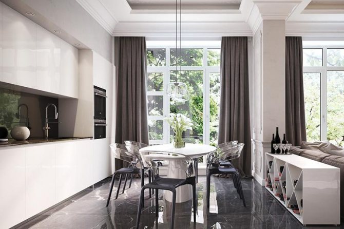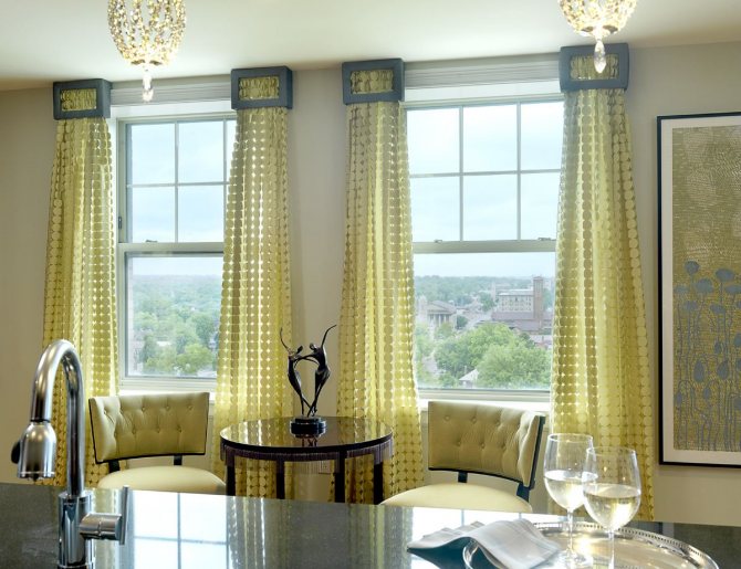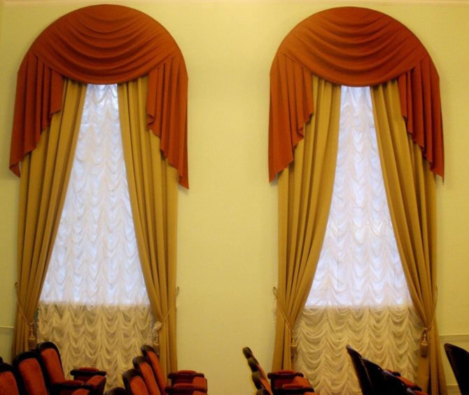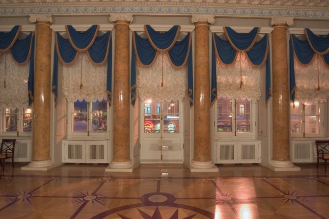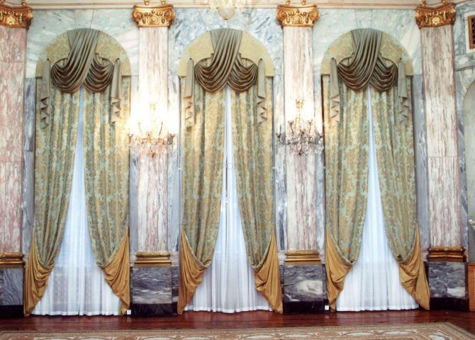 Sur les grandes fenêtres qui ressemblent au style du classicisme strict, vous pouvez utiliser des variantes de rideaux:
