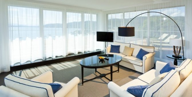 Les rideaux autrichiens ne sont pas si exigeants à entretenir, mais l'intérieur approprié est toujours un must. Habituellement, les toiles couvrent un tiers de la fenêtre panoramique dans la partie supérieure, laissant l'espace au niveau des yeux ouvert pour la visualisation.