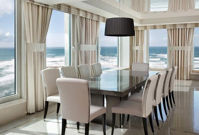 Il est préférable de choisir des rideaux assortis à la couleur de l'intérieur, afin de ne pas distraire l'œil de la belle vue.