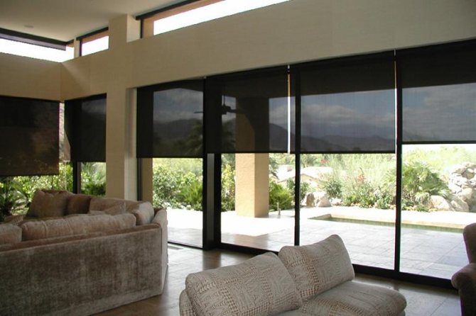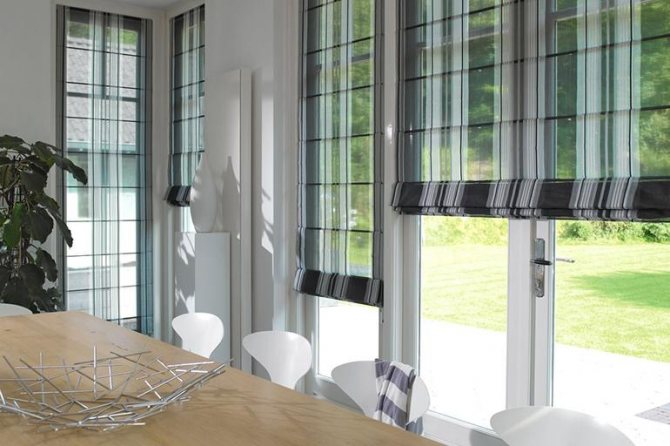 Les stores romains deviennent une option de plus en plus populaire pour décorer une porte-fenêtre. Attiré par la variété de couleurs et la fonctionnalité du design. Si les toiles sont soulevées, des plis élégants se forment et, à l'état déplié, ils atteignent le sol et se cachent de manière fiable des regards inutiles et de la lumière du soleil.