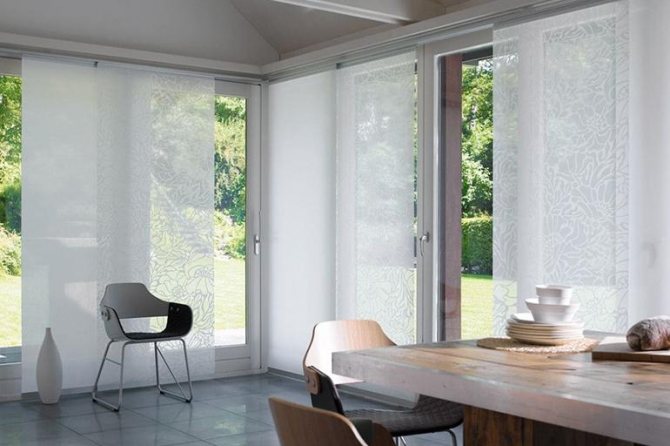 Avec une telle solution architecturale, les rideaux de la baie vitrée ne doivent pas gêner l'ensoleillement de la pièce et ne pas surcharger la pièce avec un volume excessif.