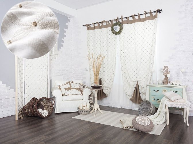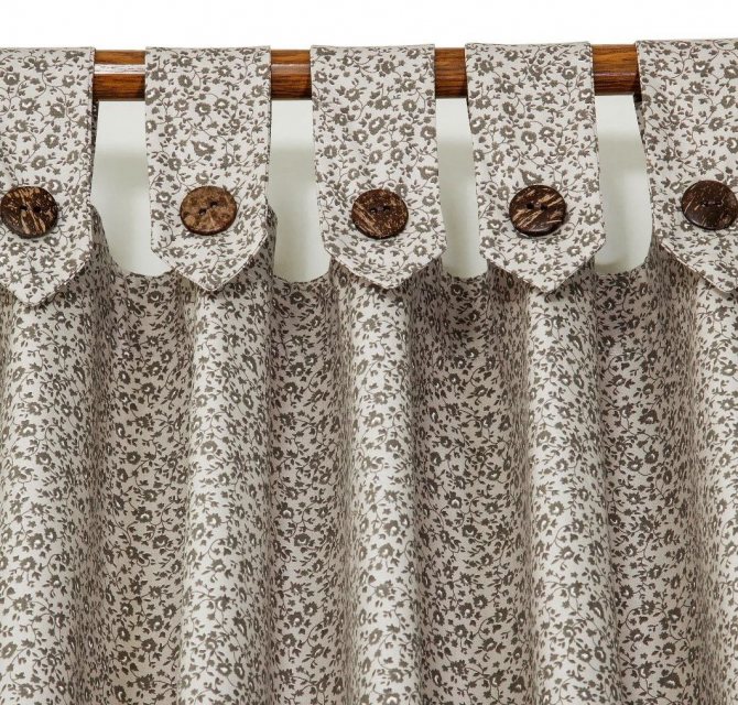 Les boucles en tissu d'une couleur différente sont très jolies. Vous pouvez faire le revêtement des boutons avec un tissu brillant et le rideau acquerra un personnage intéressant et amusant. Vous pouvez ramasser des boutons en bois - c'est incroyable avec une corniche en bois!