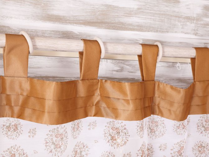 Les boucles en tissu sont considérées comme les plus courantes. Pour une telle tâche, vous aurez besoin d'une tresse et de bandes d'un matériau sélectionné à l'avance, dont la largeur est la mieux adaptée au rideau.