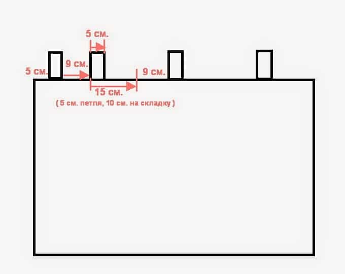 La largeur de la boucle est une taille standard de 5 cm, et sa longueur de pliage est de 10 cm.Il existe des modèles de rideaux froncés, dans lesquels les points sont également froncés en plis. Pour eux, la largeur des boucles doit être augmentée à 15 cm et la longueur jusqu'à 14 cm.