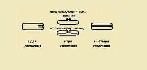 - Le moyen le plus pratique de traiter les côtés des boucles est "en trois plis", mais pour les tissus transparents, cela ne convient pas, car la couture centrale brillera jusqu'à la face avant (la taille de la pièce est déterminée comme trois largeurs de la boucle);