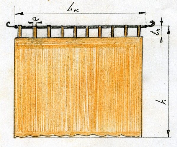 Tout d'abord, vous devez connaître la distance entre les pointes de la corniche, c'est-à-dire sa longueur de travail (L), la hauteur de la ligne de suspension au sol (H) et le diamètre de la tige (d): une précision excessive n'est pas nécessaire ici, les mesures peuvent donc être prises avec une règle ordinaire ou avec un ruban à mesurer. Sur une feuille de papier, dessinez un croquis du futur rideau, sur lequel vous indiquerez ensuite les dimensions de base calculées - la hauteur du rideau (h), la longueur et la largeur des boucles (l et a, respectivement).