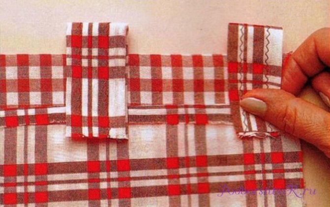 Placez cette bande sur les boucles et fixez-la avec des épingles. Le bord supérieur est cousu en reculant de 1 cm, puis cette bande est éteinte et le rideau est lissé, les boucles doivent être dirigées vers le haut. Il reste à plier et à coudre la bande de passepoil à partir des bords restants.
