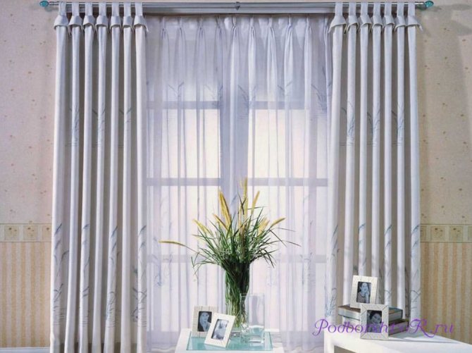 - Rectangulaire simple - lorsque des bandes de tissu sont attachées au haut de la toile (le même que celui à partir duquel le rideau est cousu ou contrastant). Cette option de fixation est appelée sourd - si vous ne retirez pas la corniche, vous ne pourrez pas retirer le rideau.