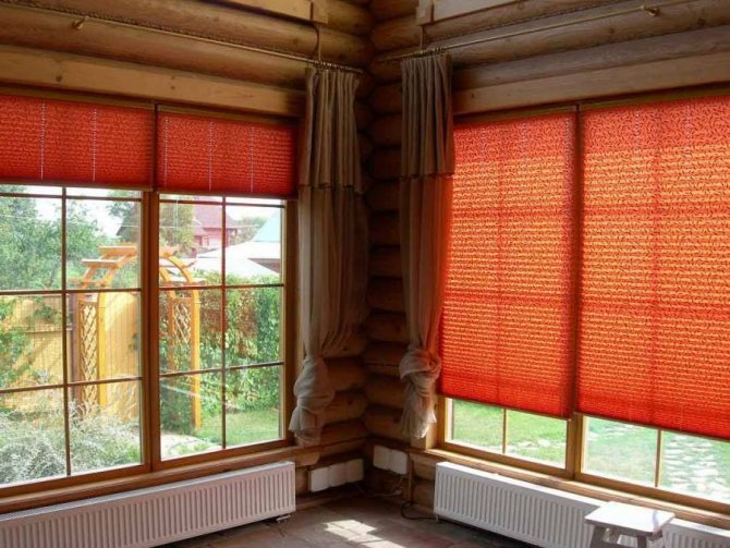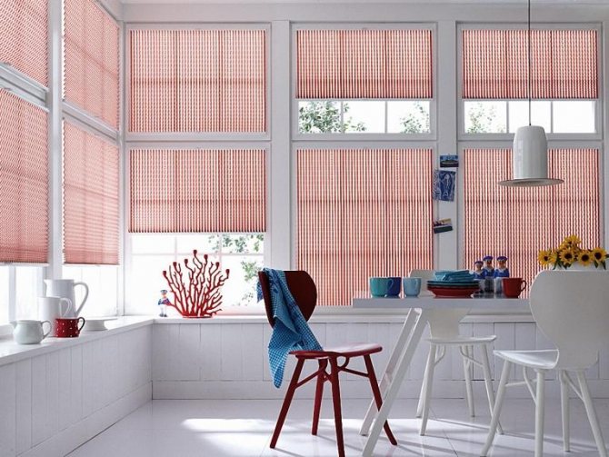 Si la taille de la pièce vous permet de ne pas penser à utiliser le rebord de la fenêtre, de tels rideaux peuvent être installés dans l'ouverture sur toute sa largeur. Il est conseillé d'utiliser les options «Haut et Bas», vous permettant d'ouvrir cette partie de la fenêtre, la pénétration de la lumière à partir de laquelle sera la plus pratique pour chaque heure de la journée.