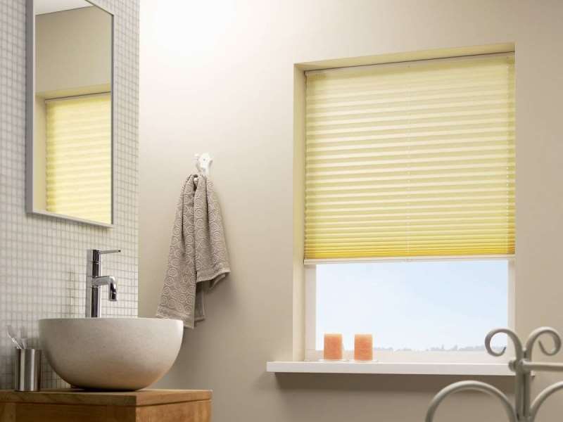 Dans la salle de bain, ce décor a l'air plus que approprié. Naturellement, étant donné l'humidité élevée de cette pièce, vous devez choisir des modèles avec une imprégnation résistante à l'humidité et les stores en papier plissé ne fonctionneront pas ici.