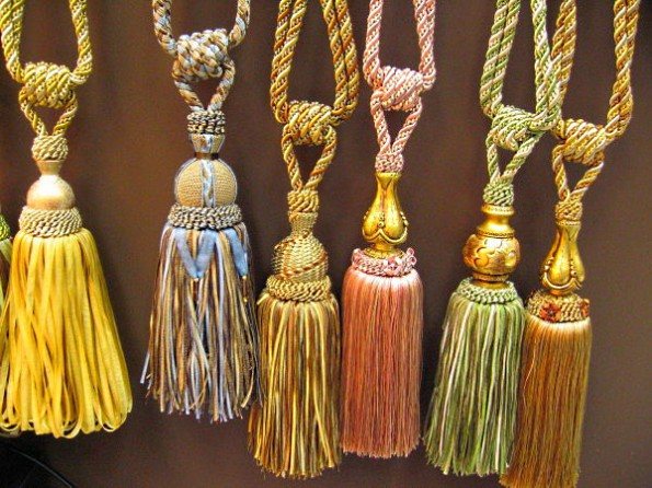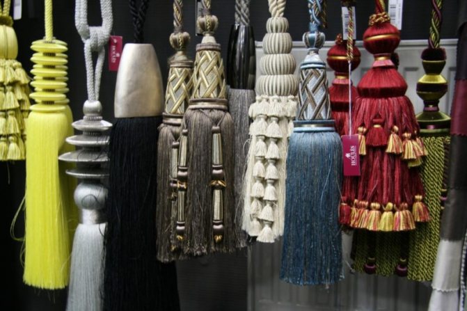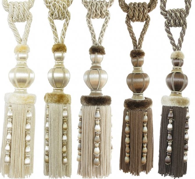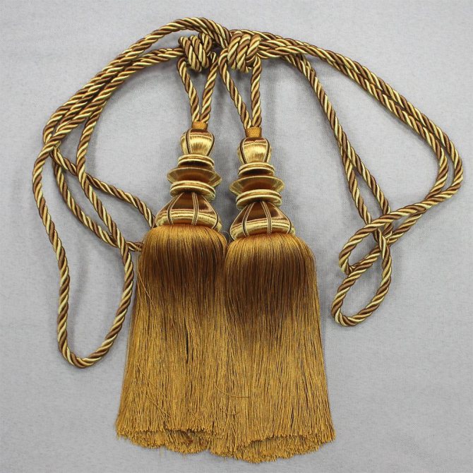 Les pompons du rideau sont un faisceau de fils noués au milieu avec un ruban magnifiquement conçu. Des tissus tels que l'organza, la laine, le coton, les synthétiques sont utilisés pour la fabrication de grappins. Pour une décoration supplémentaire pour les glands, les perles, les clairons, des cristaux de différentes bases peuvent être utilisés. Dans les temps anciens, des pierres précieuses et des métaux semi-précieux étaient utilisés pour décorer ces accessoires.