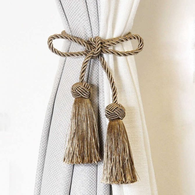 Pour rendre les rideaux harmonieux, les ferrures doivent être sélectionnées en fonction du statut des rideaux. Les rideaux luxueux, «ceinturés» de cordons bon marché, auront l'air plus que modestes, et légers rideaux volants, accompagnés de lourdes cordes aux pompons moelleux massifs, insipides.