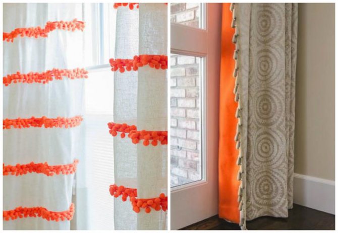 La combinaison de tissu avec du bambou, du plastique, des éléments en bois, des pompons, des pompons, des cloches gagne en popularité. L'essentiel est de ne pas en faire trop avec des décorations, afin que tout ne se transforme pas en un tas grossier et vulgaire. La première règle est de choisir des décorations en apesanteur pour les rideaux fins délicats, des décorations lourdes pour les rideaux massifs.