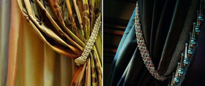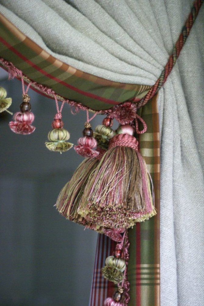 Les cordons torsadés multicolores avec des pompons sont une décoration noble. Ils sont particulièrement beaux sur les tissus d'élite exquis: brocart, velours, velours, soie dense. Il est facile de draper un tissu épais avec leur aide - il suffit de l'attacher comme une ceinture au bon endroit. Souvent, ces rideaux sont monotones et riches en couleurs, et les cordons animent leur monotonie.