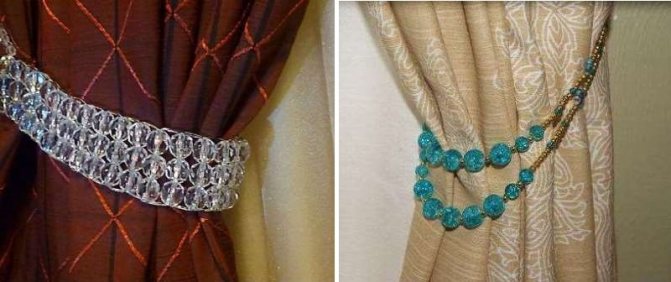 Les attaches de rideaux en perles conviennent aux motifs de rideaux solides ou pâles dans la chambre et le salon. Ils ont l'air exquis, créent une chambre, une atmosphère apaisante. Pour créer des perles pour rideaux, vous pouvez prendre des bijoux prêts à l'emploi ou les assembler vous-même, en utilisant non seulement des perles, mais aussi des strass, des perles, toutes sortes de chaînes décoratives qui sont en harmonie dans la texture et la couleur avec le design de la pièce.