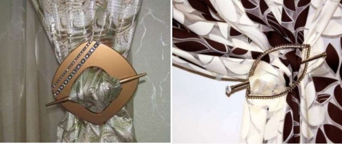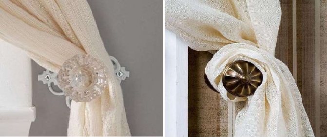 Les accessoires de formes complexes, de couleurs vives, décorés de ferrures brillantes, conviennent aux rideaux unicolores. Pour les rideaux en tissu imprimé avec un motif complexe, il est préférable d'utiliser de simples crochets du même tissu ou des cordons à pompons.